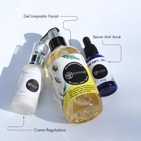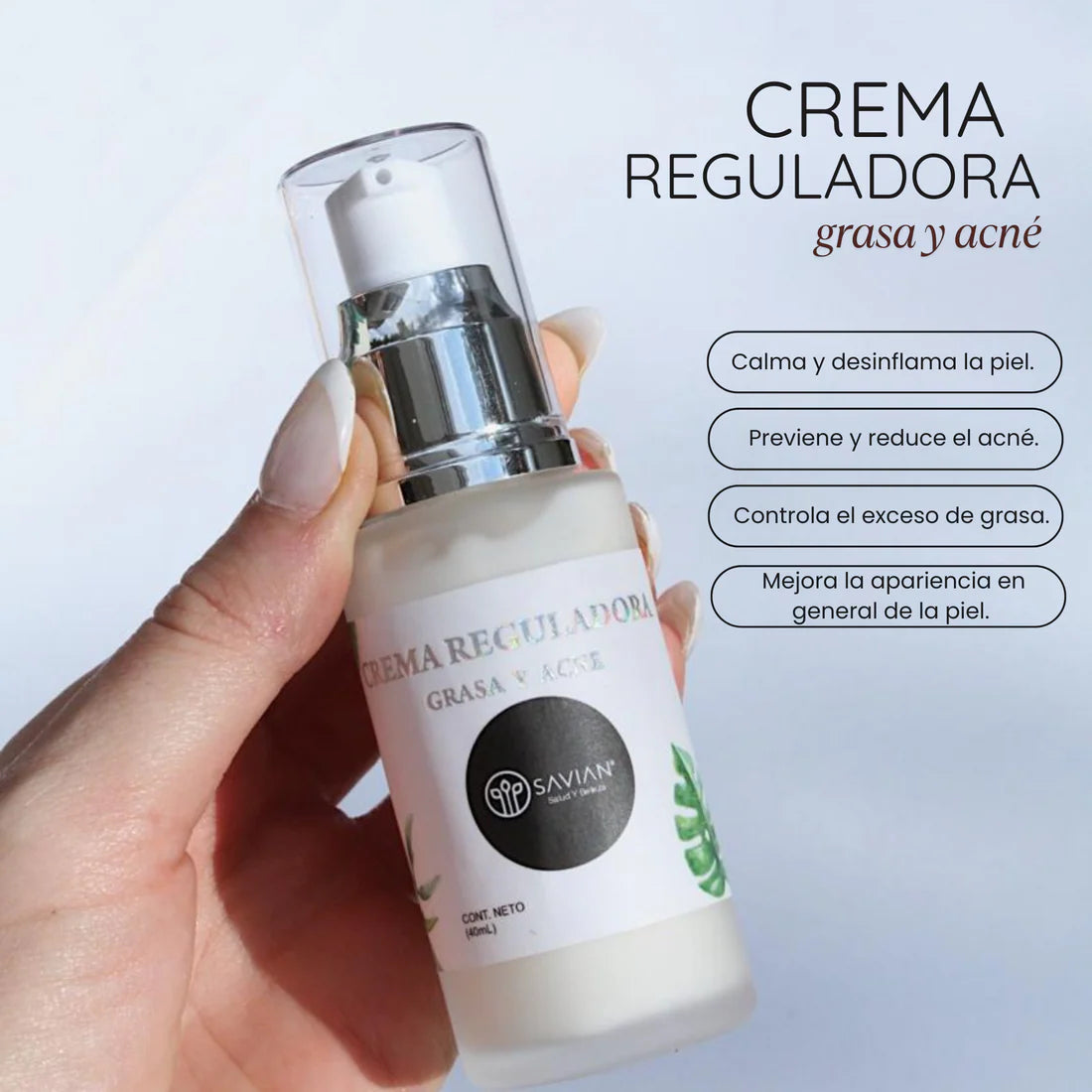 3. Crema Reguladora: Reduce y controla la sobreproducción de sebo, purifica y combate el acné, calma la piel, fortalece la barrera cutánea y humecta el rostro.
